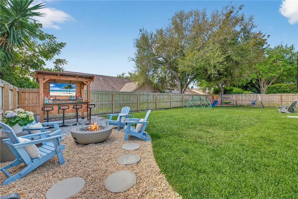 This fully renovated single-family residence has been thoughtfully redesigned with everyday living, entertaining, and safety in mind. The completely reimagined kitchen serves as the heart of the home, featuring custom cabinetry, quartz countertops, a large island, GE Café Series appliances (2022), a custom vented hood, generous pantry storage, and a dedicated coffee bar for added convenience. Throughout the home, plank-style porcelain tile flooring creates a seamless, modern look, complemented by downlighting in every room and plantation shutters for both comfort and style. The primary suite offers a private retreat with direct access to the expanded lanai, a beautifully updated en-suite bath, two custom-designed closets, and remote privacy shades for added comfort and convenience. Additional guest bedrooms provide flexibility for family, visitors, or a home office, while the guest bathroom has been fully renovated with a Kohler cast iron tub. Beyond aesthetics, the home offers exceptional peace of mind with extensive upgrades throughout, including NEW ROOF 2024, NEW PLUMBING 2024 (FULL REPIPE), NEW ALLINI WATER FILTRATION SYSTEM, NEW PAINT INSIDE AND OUT 2024, NEW AC AND DUCTWORK 2024, UPGRADED ELECTRICAL 2024, NEW IMPACT WINDOWS AND DOORS THROUGHOUT 2024, and a NEW HURRICANE-RATED CUSTOM GARAGE DOOR 2025, along with new insulation (2024), interior doors, trim, and additional thoughtful improvements designed for long-term reliability. Functionality continues with a well-appointed laundry area featuring a mudroom-style setup and utility sink, along with epoxy-coated garage floors that provide a clean, durable, and polished finish. Step outside and experience a property designed for gathering and enjoying the Florida lifestyle. The expanded lanai flows seamlessly into a NEW EXPANDED LANAI and outdoor living space featuring a NEW BUILT-IN OUTDOOR BAR with seating for four, a firepit area, and a spacious backyard with room to add a large pool. The NEW CIRCULAR DRIVEWAY, walkway, and rear patio elevate both curb appeal and functionality, while fresh landscaping and low-voltage lighting create a warm, inviting setting day and night. This home has truly been a place for connection and celebration, offering ample space to host everything from relaxed evenings by the firepit to larger gatherings, with room for outdoor entertainment, bounce houses, and even a temporary pool setup for family fun. Boca Palms offers residents a gated entrance, community pool, tennis and pickleball courts, and is located within a highly regarded school district. Just minutes from Naples’ white sand beaches, shopping, dining, and entertainment, this location delivers both convenience and lifestyle. This is a rare opportunity to own a move-in-ready home where the hard work has already been done.