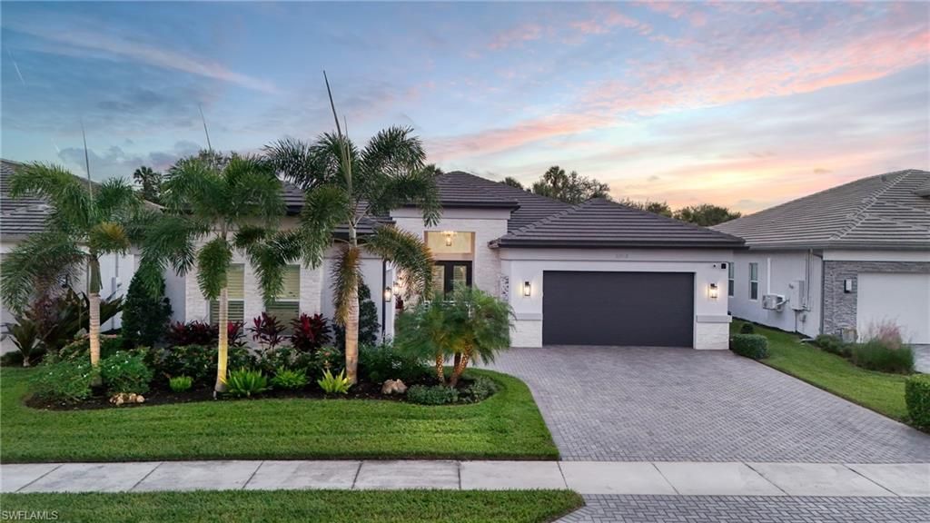 Don’t miss a rare opportunity to own this move in ready home with a pristine preserve view; southern exposure enjoyed from the large covered lanai, resort style pool in a prestigious gated resort community in Naples. This newly constructed Estero floorplan by GL Homes occupies a prime lot backing directly to a private preserve owned by Valencia Trails—meaning it can never be developed. This ensures lasting quiet and unobstructed natural views, while the property remains just a short walk to the impressive clubhouse and resort-style amenities. Spanning 3,154 square feet under air, the residence offers 3 bedrooms, 3 full baths, and a convenient half bath (cabana/guest powder room). The versatile club room, with its own separate entrance, provides flexibility as a private office, guest suite, game room, art studio, or whatever suits your lifestyle. The handsome front elevation features a gated entrance courtyard with a serene water feature, creating an elegant first impression. Beautifully designed stone front exterior presents two front-facing garage entrance for easy coming and going, and a side-entry, single-car garage for three-car covered parking overall. Thoughtfully designed for sophisticated entertaining, the open layout flows effortlessly from the gourmet kitchen to dining and living areas, enhanced by a dedicated bar space off the kitchen. The expansive covered lanai—measuring 37 x 24 feet—includes Storm Smart hurricane roll-down shutters for all-season enjoyment. It features a custom summer kitchen with Tec grill, LED lighting, sink, refrigerator, and additional refinements. The large pool, complete with auto-fill and full screen enclosure, overlooks the protected preserve. A fenced backyard offers a secure, private area for pets. Meticulously maintained from new, this home blends refined design, high-quality finishes, and the exceptional Valencia Trails lifestyle—delivering convenient North Naples access to fine dining, shopping, beaches, and more, all within a gated, amenity-rich 55+ community.