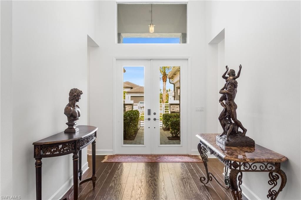 Welcome to 11764 Freesia Terrace—a rare, move-in-ready Estero in Valencia Trails’ coveted Gulfshore Collection, set on a deep, south-facing oversized 13,675 sqft homesite with tranquil preserve views and plenty of room to add a pool. This is the kind of “better-than-new” opportunity buyers wait for, offering a grand scale of living and lot size. Spanning 3,126 sq. ft., the home features 3 bedrooms, 3.5 baths, a versatile Club Room, and a split 3-car garage. A standout feature is the Club Room, boasting a private French door entry from the front courtyard—ideal for a high-end home office, media lounge, or guest retreat with true separation. Inside, gorgeous wood flooring flows seamlessly, enhanced by crown molding and recessed lighting. The primary suite feels like a sanctuary, complete with a custom closet system and a spa-style bath designed for comfort and function. Beyond the beauty, this home delivers the big-ticket aftermarket upgrades buyers care about most: full impact windows and doors, a whole-home natural gas Generac generator, dual air handlers, and mini-split A/C units in both the 1-car and 2-car garages. Smart home tech includes automation for lighting and locks, security cameras, a video doorbell, and pre-wired whole-home ceiling speakers with Sonos amps. Everyday convenience is elevated by a Culligan water softener with a kitchen RO system, plus custom laundry cabinetry with countertops. The chef’s kitchen is built to impress with GE Profile appliances, soft-close glass display cabinetry with puck lighting, and an island beautifully wrapped in matching cabinet panels. A full-height quartz backsplash extends behind the hood for a custom look, and entertaining is effortless with a dedicated bar area pre-plumbed for a sink. Step outside to the extended, covered lanai showcasing upgraded herringbone pavers, a convenient cabana bath, and motorized hurricane screens for instant shade. The lanai is pre-plumbed and wired for a full summer kitchen, includes a hardwired WiFi extender, and features a bright outdoor TV that stays. Valencia Trails completes the package with a resort lifestyle centered around a magnificent 43,000 sq. ft. clubhouse. Enjoy a full restaurant and bar, theater, fitness center, multiple pools (including lap and resistance), pickleball, tennis, bocce, walking trails, dog parks, and nonstop social events. If you want Gulfshore Collection scale, a private preserve setting, and a fully upgraded home that’s ready now, this is the one.