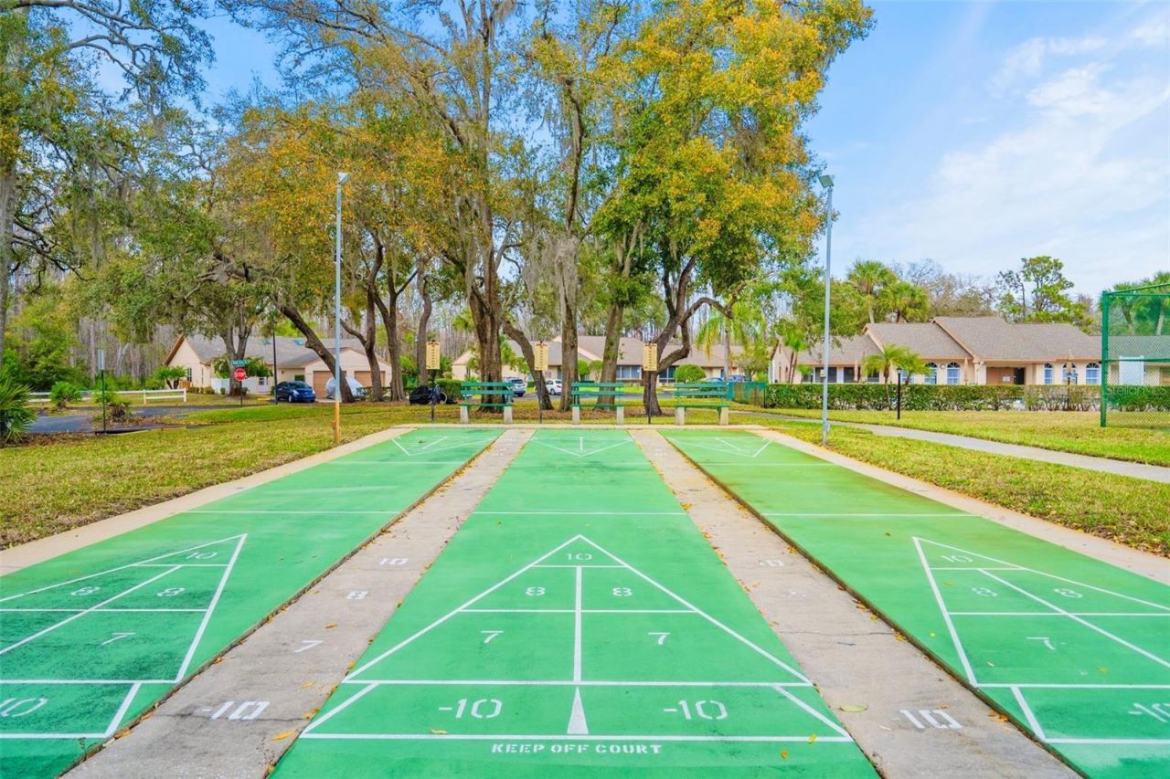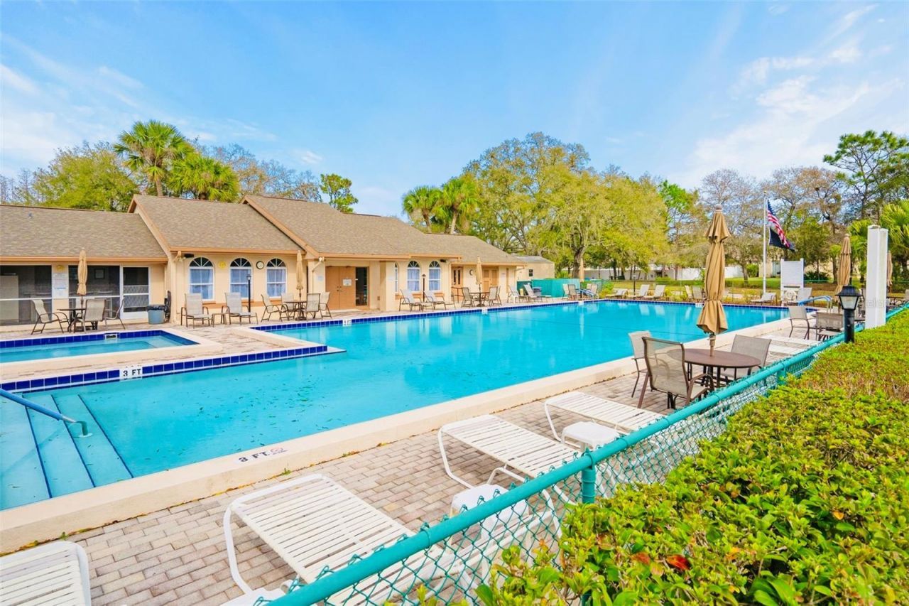 This is your opportunity to secure a well-maintained villa in the desirable 55+ community of Pine Ridge at Sugar Creek Village. Offering true maintenance-free living, this home is ideal for buyers seeking comfort, convenience, and a relaxed Florida lifestyle without the upkeep. Community amenities include a heated pool, recreational facilities, and comprehensive services such as cable, internet, exterior and grounds maintenance, pest control, water, sewer, and trash providing both value and peace of mind. Privately situated within the community, this 2-bedroom, 2-bath villa offers a rare combination of privacy and outdoor space, with no front or rear neighbors, just open green space for a more serene setting. The home is optionally partially furnished, making it easy for a buyer to move right in or personalize to their taste. A gated entry and detached garage lead to a welcoming front patio that functions as a private courtyard, perfect for morning coffee, entertaining guests, or enjoying Florida's year-round sunshine. Inside, the open-concept design features soaring ceilings and a skylight that fills the living space with natural light, creating a bright, airy feel. The kitchen offers stainless-steel appliances, and a convenient pass-through to the main living area, enhancing flow and functionality. A versatile flex space overlooking the open field provides the perfect setting for a home office, reading nook, or hobby area, an increasingly desirable feature for today's lifestyle. The primary suite includes a walk-in closet, private en-suite bath, and sliding glass doors that open to the rear lanai. With access from both the living room and bedroom, the indoor-outdoor connection is seamless while still maintaining privacy. The lanai is windowed and screened so it can be enjoyed year around regardless of the weather. Recent updates include a freshly painted patio, roof (2020), replacement windows (2007 & 2023), and luxury vinyl plank flooring. Conveniently located near Highway 52 with quick access to the Suncoast Parkway and Veterans Expressway, this home offers easy connectivity to the greater Tampa Bay area. Medical facilities, shopping, dining, and daily conveniences are all just minutes away, with Gulf Coast beaches close enough for a spontaneous sunset dinner.