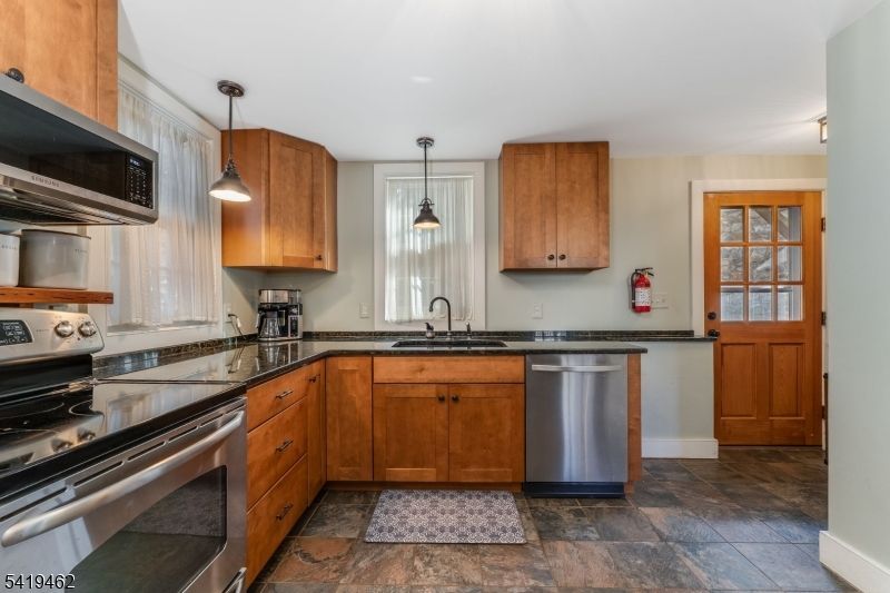 Set in the charming town of Finesville, this 1800s stucco and stone colonial offers a thoughtful blend of original character and modern updates.Inside, the living and dining spaces feature exposed stone walls, beamed ceilings, and wide pine floors, centered around a pellet stove with a classic mantel. The kitchen, located in a newer addition, includes granite countertops, custom cabinetry, a pantry, and radiant heated floors that extend into the adjacent powder room.Upstairs offers three bright bedrooms. Two in the original section feature pine floors, deep window sills, and access to a walk-up attic. The third bedroom and full bath, in the newer portion, include bamboo flooring, radiant heat, and a tiled bath with exposed stone and a walk-in shower.A private patio and hot tub sit just off the kitchen, overlooking a backyard filled with perennials. Additional updates include replacement windows, storm doors, newer septic and well, and updated heating and electric. Close to Alba Vineyard, the Delaware and Musconetcong Rivers, and nearby river towns for dining, shopping, and the arts. Easy access to NYC. NOT IN FLOOD ZONE