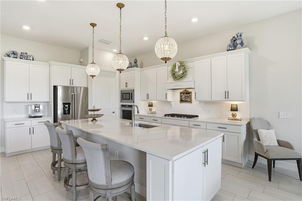 Lush landscaping provides exceptional privacy, while the extended lanai is enhanced by a custom outdoor kitchen, creating the perfect setting to enjoy Naples’ signature indoor-outdoor lifestyle. Inside this "Stellar" floor plan featuring 3 bedrooms + den and 3 full baths, you’ll find curated designer wallpaper, upgraded lighting, and elegant ceiling fans that add warmth and sophistication throughout—showcasing attention to detail at every turn. The fully upgraded built-in kitchen serves as the heart of the home, complete with high-end appliances, natural gas cooktop, and an impressive 12-foot island ideal for gathering and entertaining. The expansive great room flows seamlessly beneath soaring 11-foot ceilings, enhancing the open, airy feel of the living space. Generous three car garage also featured as well as plenty of room in the backyard to build your dream outdoor oasis! Located within one of Naples’ most amenity-rich gated communities, residents of Terreno enjoy access to a resort-style pool, lap pool, pickleball, tennis, fitness center, golf privileges, dog park, playground, and the beloved Olive & Thyme restaurant—delivering a true lifestyle experience beyond the home itself.