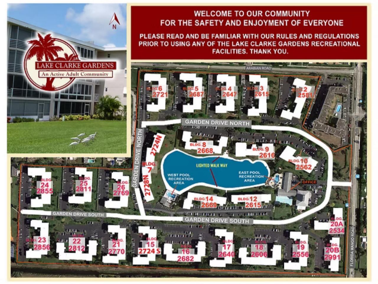 Priced to RENT!!! Beautifully updated, fully furnished first- floor condo in a vibrant 55+ community. This unit offers a rare stunning lake view in the best location Lake Clarke Gardens has to offer- this prime located unit is only few steps to the pool, dedicated parking spots, clubhouse and laundry. This move in ready unit features no carpet, a spacious walk-in closet-all you need is your toothbrush! Community amenities include two pools, saunas, fitness center, billiards, putting green, shuffleboard and bocce ball, plus a complimentary shuttle bus. Only minutes to shops, restaurants, airports, beaches and casinos. This condo combines comfort, convenience and a vibrant lifestyle with daily social activities! Great way to enjoy the Florida lifestyle.