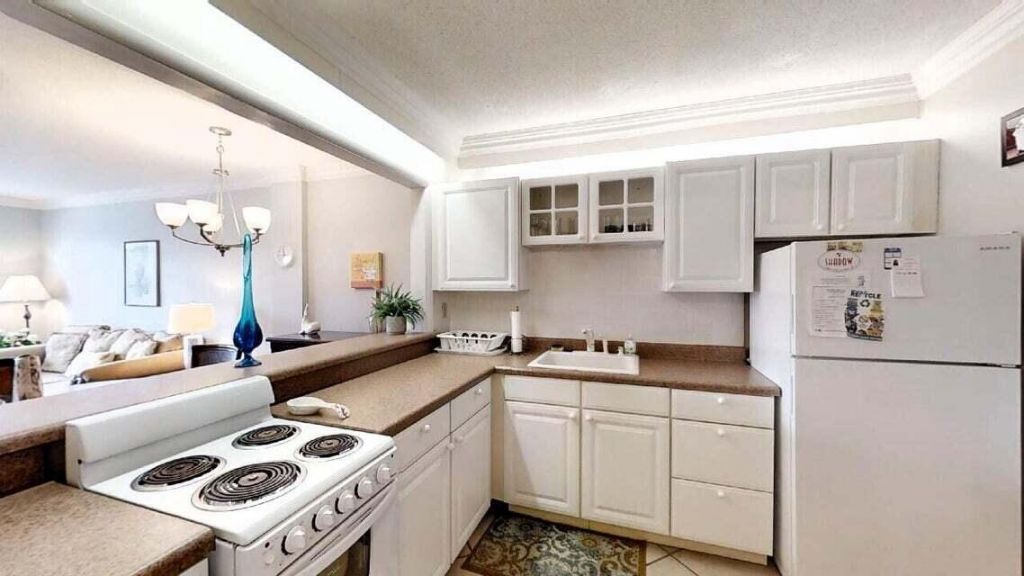 Absolutely adorable 1 bedroom, 1 bath updated with new kitchen cabinets, ceramic tile throughout, walk in shower, walk in closet in bedroom, sliding glass door from bedroom to spacious patio overlooking the pond. Living room has a huge picture window that is impact glass, kitchen has an extra large opening passthrough to dining area. This beautiful unit comes completely furnished with an extra murphy type bed, all the dishes, pots, pans, etc. Completely turnkey.