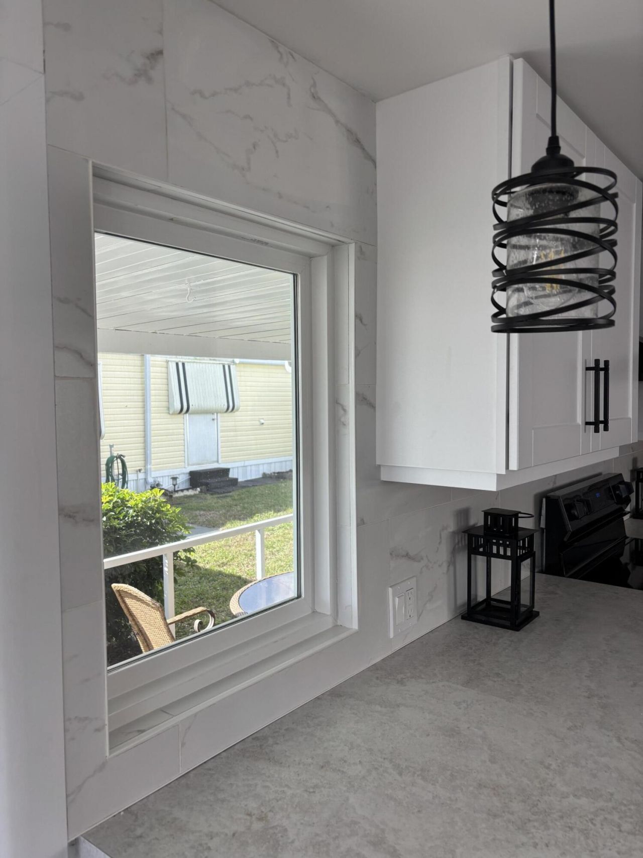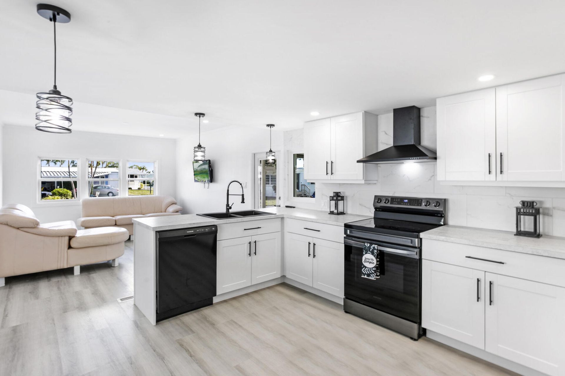 This beautifully remodeled home in a desirable gated community comes with NO land lease and has been upgraded from top to bottom. The kitchen showcases white shaker-style cabinets with sleek black handles, new appliances, abundant counter space, a breakfast bar, and a dining area. The open floor plan flows into a spacious living room that connects to a freshly screened patio, perfect for relaxing or entertaining. Inside, you'll find brand new vinyl flooring, updated drywall, 3/4-inch plywood subflooring, fresh insulation, new windows, a tankless water heater, and a washer and dryer conveniently located within the home. The interior has been freshly painted and exterior has new vinyl siding. Additional upgrades include LED lighting, new plumbing, new electrical panel, new interior and exterior doors, and a freshly sealed roof. Just steps away from the clubhouse, residents can enjoy two heated pools, pickleball, shuffleboard, billiards, a library, and a vibrant social calendar. With a low monthly fee of only $250 covering internet, water, sewer, 24/7 manned gate security, on-site management, and all amenities, this move-in-ready home is waiting for its new owners.