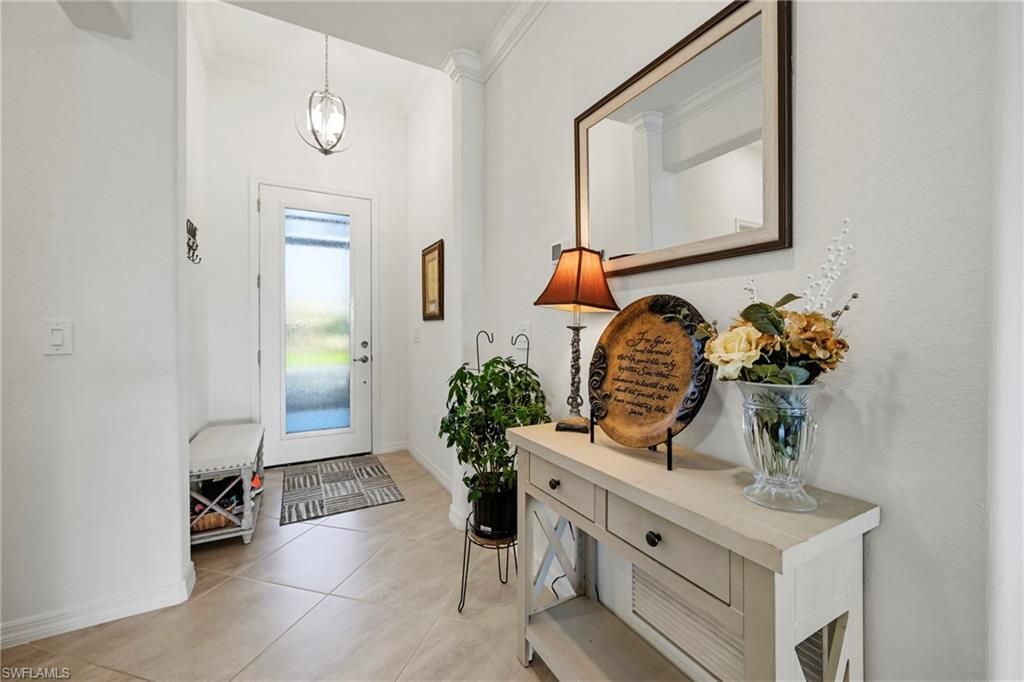 Gorgeous LAKE VIEW POOL HOME in a premier Fort Myers community. Featuring the popular Tivoli floor plan, this meticulously maintained residence offers 4 bedrooms, 3 full bathrooms, and a 3-car garage. From the moment you arrive, the attention to detail is evident, starting with the custom front screen door, allowing for wonderful seasonal cross-breezes. Built for entertaining, the expansive kitchen features granite countertops, a stylish tile backsplash, and custom wood trim on the kitchen island that adds a sophisticated, furniture-grade touch. The kitchen is completed by a breakfast bar, center island, stainless steel appliances, and a bright breakfast room. Adjacent to the main living area, the dining space is further elevated by elegant custom wood wall trim, creating a polished and inviting atmosphere. The spacious owner’s suite serves as a true retreat, featuring custom closet built-ins for maximum organization. The en-suite bath offers a large, glass-enclosed shower and two separate vanities. Outdoors, a paver lanai is enhanced by the sparkling, screened pool with Eastern rear exposure for beautiful morning sunrises over the tranquil lake. Additional features include diagonally laid tile flooring throughout the main living space, crown molding, a wide paver driveway, and lush tropical landscaping. Located in Portico, a gated community in a prime Fort Myers location, residents enjoy access to a clubhouse with a resort-style pool and spa, basketball, pickleball and tennis courts, a fitness center, and play area. Ideally positioned near I-75, shopping, dining, and everyday conveniences, this home offers easy access to everything you need. Come see what makes this lakefront home truly special—your next chapter starts here.