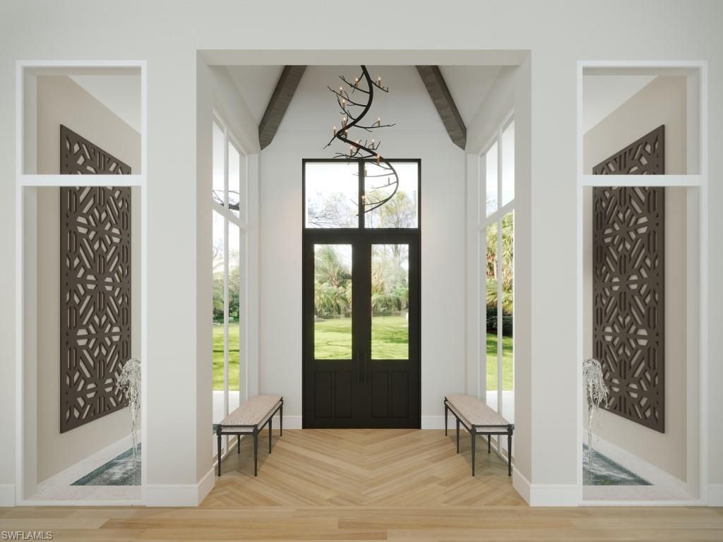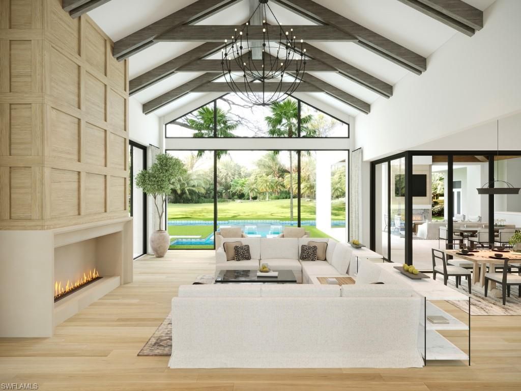 One or more photo(s) has been virtually staged, AI generated or rendered. Award winning McGarvey Custom Homes presents an extraordinary custom home in Pine Ridge Estates offering unmatched luxury, privacy, and architectural distinction. Situated on an oversized 1.53 acre corner lot, this dramatic residence impresses from the moment of arrival with three gated entrances showcased by an expansive port cochere and breezeway leading to the grand entry which is framed by double iron doors, custom water features, and a foyer surrounded by full height glass. Designed for elevated living and entertaining, the open concept interior features soaring 20 foot vaulted ceilings, bespoke ceiling beams, wide plank European walnut hardwood flooring, and an extensive use of glass and natural light. Zero-post corner sliding doors seamlessly connect the indoors to the resort style outdoor living areas. The gourmet kitchen is a true showpiece with dual islands, Bellagio quartzite surfaces, custom cabinetry, vaulted ceilings with wood beams, and a full Sub Zero, Wolf, and Cove appliance suite. A full butler’s pantry, built in wet bar with island, and the custom wine room further enhance functionality and flow. This exceptional home offers five ensuite bedrooms including a private attached guest cabana. Additionally, a second floor bonus area provides access to a large flex room with a private balcony overlooking the pool and sundeck. The bonus floor also includes a built-in bar, a full bath, and walk-in closet, offering perfect space for a private wellness room, fitness center, media room, or an additional guest room. The owner’s suite is a serene retreat with pool and courtyard views with a large sitting area, morning bar, elegant his and her vanities, quartzite countertops, freestanding soaking tub, walk in shower, separate water closets, and expansive walk in closets featuring custom built ins, as well as a private laundry tower, and smart steam closet system. The outdoor living area rivals luxury resorts with an expansive covered lanai, custom pool and spa, sun shelf, outdoor kitchen and dining, fireplace, firepit, electric shutters and screens, lush tropical landscaping, and an insect mist control system. Six oversized garage spaces are offered with a main house 4-car garage and a separate 2-car garage. A whole house generator, Control4 home automation, security system, advanced energy efficient construction, impact resistant windows and doors, and high efficiency HVAC system with dehumidification complete this meticulously built residence. Professional interior design and furnishings are being provided by the renowned Freestyle Interiors and Design. This home is currently under construction, and the estimated completion date is December 2026. This is a rare opportunity to own an architecturally significant estate crafted with uncompromising quality in one of Naples’ most coveted communities.