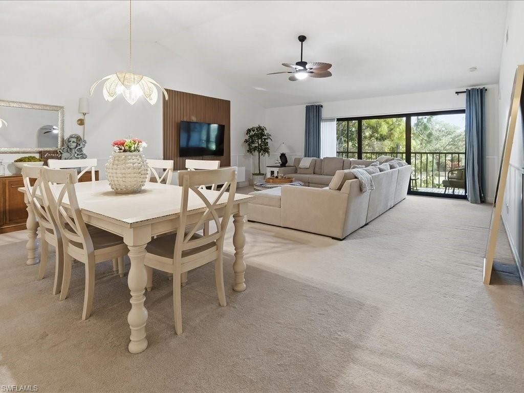 Welcome to this beautifully maintained and spacious two-bedroom, two-bath condo located in the desirable Deauville Lake Club. This wide floor plan offers soaring cathedral ceilings and serene golf course views, creating a light and airy living space. The home features impact glass windows and sliders, a striking feature wall in the living room, and upgraded showers in both the primary and guest bathrooms. The refrigerator and dishwasher were replaced in 2024, adding modern convenience to the kitchen. Covered parking is included. Recent community improvements include a new roof completed in 2023 and freshly painted buildings. Deauville Lake Club offers an active yet relaxed lifestyle with two community pools, a spa, tennis courts, shuffleboard, clubhouse activities, grilling areas, and scenic walking paths. This quiet, friendly community is ideally located just minutes from downtown Naples, local beaches, and the restaurants and shops of 5th Avenue.