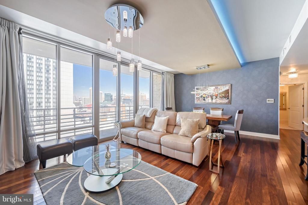 Experience elevated city living in this spectacular corner two-bedroom, two-bath residence at The Vue, ideally positioned in the heart of Harbor East with sweeping water and skyline views. Framed by oversized windows, this exceptional home captures breathtaking vistas of the Inner Harbor, Patapsco River, and cityscape, creating a stunning backdrop from sunrise to sunset. Designed with both sophistication and comfort in mind, the residence features a newly renovated gourmet kitchen with sleek custom finishes, an expansive island perfect for entertaining, and seamless flow into the open-concept living and dining spaces. Every detail has been thoughtfully curated, including designer lighting, upgraded flooring, and striking custom wallpaper, all contributing to its triple mint condition. The spacious living area extends effortlessly to an expansive private balcony, offering the perfect setting for morning coffee, evening cocktails, or simply taking in the vibrant waterfront energy below. Motorized blinds and custom drapery add both convenience and elegance throughout the home. The luxurious primary suite is a true retreat, featuring dramatic corner windows, a walk-in closet, and a spa-inspired bath complete with a soaking tub and glass-enclosed shower. A generous second bedroom and full bath provide flexibility for guests, a home office, or additional living needs. One covered parking space is included. Residents of The Vue enjoy unrivaled convenience in one of Baltimore’s most sought-after neighborhoods, just steps from the city’s finest dining, boutique shopping, Whole Foods, Starbucks, the waterfront promenade, nightlife, Harbor East Cinemas, and direct elevator access to the MAC gym. A rare opportunity to lease a fully customized, move-in-ready luxury waterfront residence in one of Harbor East’s premier full-service buildings.