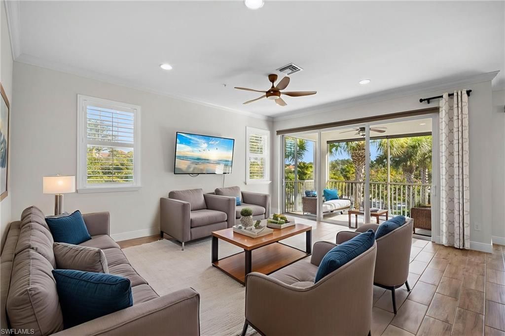 Experience the ultimate in coastal luxury in this meticulously maintained coach home within the exclusive, gated enclave of Avalon of Naples. This bright, open-concept residence lives like a single-family home, featuring durable plank tile flooring and a seamless transition to a large, screened lanai via a wall of glass sliders. The designer kitchen is a chef’s dream, anchored by a custom ship-lap island and outfitted with quartz countertops, upgraded cabinetry with pull-out shelving, and premium stainless appliances. Built for both style and security, the home boasts full hurricane impact windows and doors, plantation shutters, and remote-controlled shades. Every detail has been elevated, from the custom-organized master suite closet to the reinforced storage systems in the garage. Nestled on 17 lush acres with serene lake and preserve views, this pet-friendly community offers a boutique lifestyle just minutes from the world-class dining, shopping, and white-sand beaches of downtown Naples.