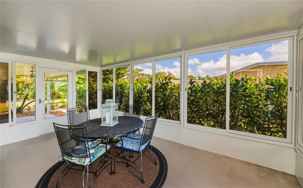 Welcome to the 'Serene Sanctuary - where privacy, outdoor living, and an effortless Florida lifestyle come together in one exceptional property that is located in the highly sought-after 55+ gated community of Tangerine Woods - and yes, *YOU OWN THE LAND!* What truly sets this home apart is the expansive and incredibly private 420 sq ft outdoor retreat - a unique find in this community. Thoughtfully designed and surrounded by lush calusia landscaping, this space offers a secluded, peaceful setting perfect for morning coffee, entertaining guests, or simply enjoying the Florida breezes in total privacy. Paired with an extra-large backyard, .21 ACRES in total, this property is a dream for pet owners and outdoor enthusiasts alike - something you simply don't find often here. Perfectly positioned on a quiet cul-de-sac with minimal traffic, the home also features beautifully manicured professional landscaping with modern concrete curbing. Inside, coastal luxury vinyl flooring flows seamlessly throughout, complementing the light, airy feel of the home. A rare indoor laundry room, with storage closet AND cabinets, adds everyday convenience, and the home is being offered *TURNKEY FURNISHED* - ready for your immediate enjoyment. The chef's kitchen is both stylish and functional, showcasing quartz countertops, a spacious breakfast bar, soft-close cabinetry with multiple lazy Susans, a pass-through window to the lanai, stainless steel appliances (all updated within the last 2 years), and a combination of recessed and pendant lighting. The primary suite offers two walk-in closets, a bonus office space, peaceful views of the expansive backyard and a beautifully updated en-suite bathroom with a modern barn door. The guest bathroom has also been tastefully updated. The newly added lanai with acrylic windows provides year-round enjoyment and can easily be opened up to create an airy, outdoor patio experience - seamlessly blending indoor and outdoor living. Major updates provide peace of mind, including roof (2024), A/C (2024), and windows (2024), plus fresh interior and exterior paint. All tie downs were replaced and the crawl space barrier was evaluated and repaired! Located in Flood Zone X, most lenders will not require flood insurance. The irrigation system has been connected to Wifi, ensuring that your incredible landscaping stays green year round! Tangerine Woods offers an incredibly affordable quarterly HOA of $678, covering lawn care, basic cable, internet, and access to a vibrant clubhouse with a heated pool and spa that is maintained at 86° year-round. This golf cart-friendly, resident-owned community features pickleball, tennis, shuffleboard, bocce, ceramics with kiln, a private nature trail, and on-site storage for RVs, boats, and trailers (at no additional cost!!). Two pets are welcome, and a 90-day minimum lease policy allows flexibility. Just minutes from Englewood and Manasota Beaches, this is where coastal convenience meets active, resort-style living. Less than 5 minutes to Dearborn St, home to weekly Farmer's markets during season, monthly car shows, live entertainment and fabulous boutique shops and restaurants! Less than 5 minutes to Publix! Opportunities like this - with this phenomenal level of privacy and a truly unique outdoor space - are few and far between. Schedule your showing today and experience the Serene Sanctuary for yourself.