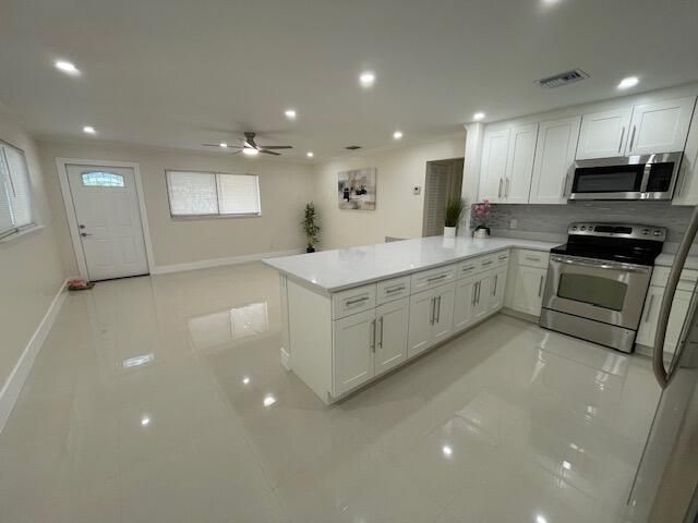 Move right into this beautiful home with high end finshes. New roof. Covered Carport. Enjoy an open-concept kitchen and living area with stainless steel appliances, central A/C, and a dedicated laundry room. Spa like bathrooms. Impact windows and doors for added value and peace of mind. 3Bed/2Bath with extra room perfect for office or guest space. 1,526 Sq. Ft. Large covered patio. Huge Oversized private fenced Lot. nearly 11,000 sq. offers endless possibilities-room for a pool, boat, RV, and outdoor entertaining area. Convenient access to I-95 and near restaurants, stores and a short drive to the beach. Don't miss this move-in-ready gem!