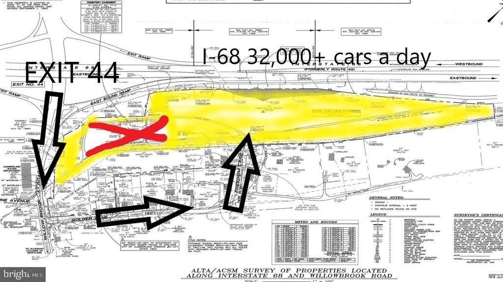 High Visibility COMMERCIAL ZONED LAND overlooking I-68 opposite Hampton Inn @ Exit 44. Over 2,500 feet of Interstate 68 frontage with 32,000+ cars per day passing by. All utilities available for intensive development, but off site access improvements will be necessary for most uses. Cemetery tract is excluded and there is an easement to access the cemetery and billboard sign.